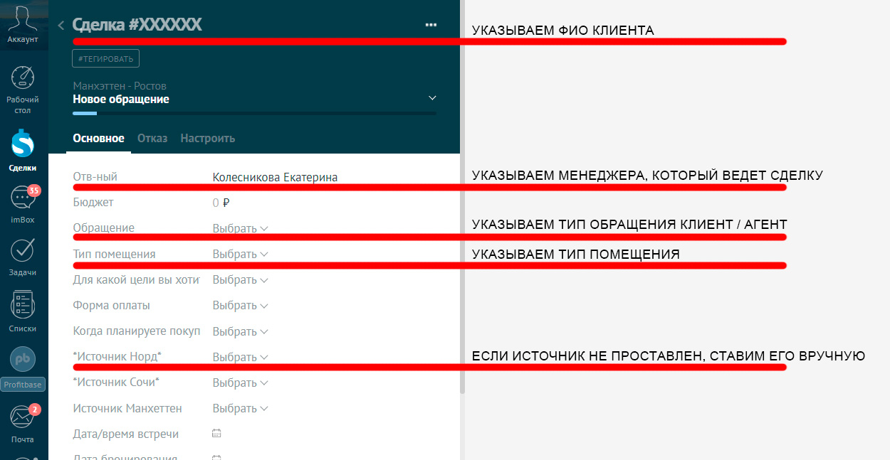 При переводе лида в другой этап воронки, данные менеджера в поле “Ответственный” и поле “Источник” проставляются АВТОМАТИЧЕСКИ! Если, по какой-то причине эти поля не заполняются, нужно проставить их вручную.