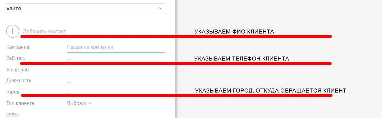 Указываем номер телефона клиента. Если их несколько, указываем все контакты.