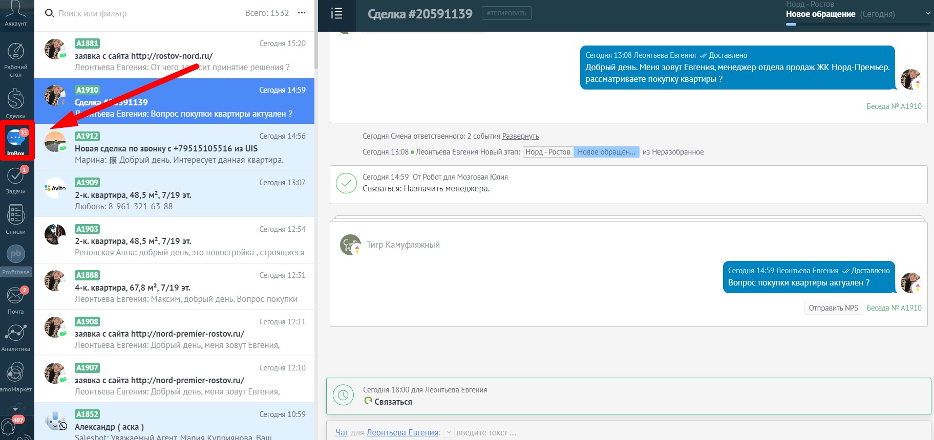 Для удобства менеджеров, чтобы не пропустить касание клиента, существует сервис ImBox, который расположен слева на панели. Он позволяет видеть все последние сообщения клиента и общаться с ним.