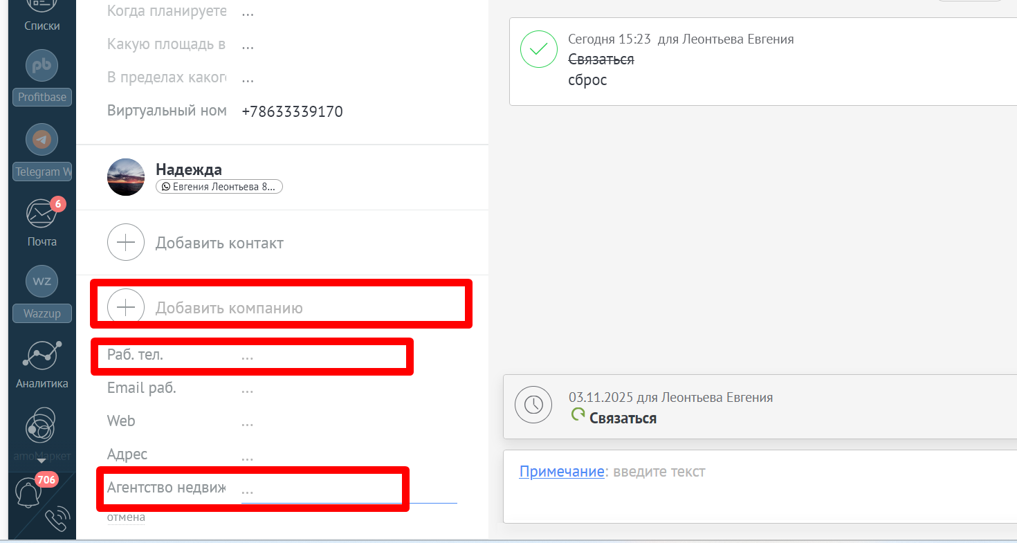 Если по какой-то причине, звонок или переписка произошла с личного телефона (у менеджера нет рабочего телефона, не работают рабочие телефоны), то в сделку необходимо приложить скриншот переписки или запись разговора.
